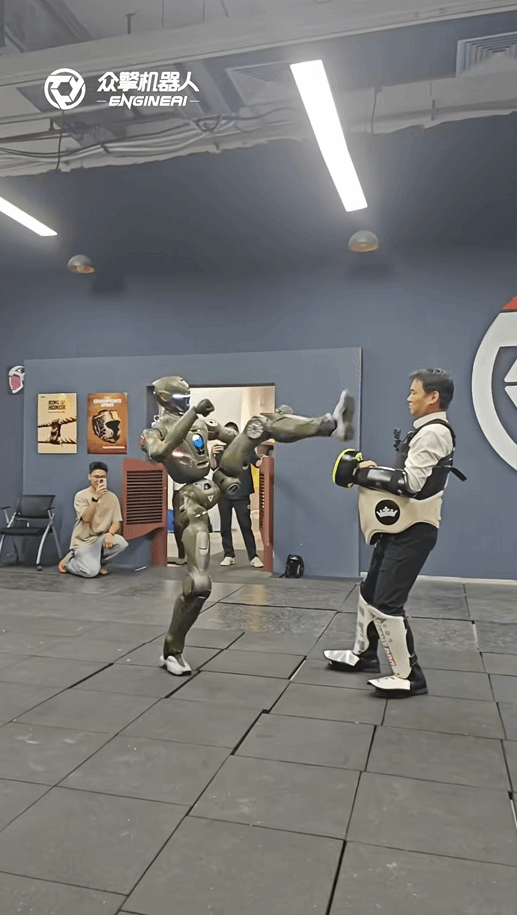 视频里,众擎CEO赵同阳身着护具,首次成功避开T800的飞踢,不过险些被正面踹到,差点用脸硬接这一招。