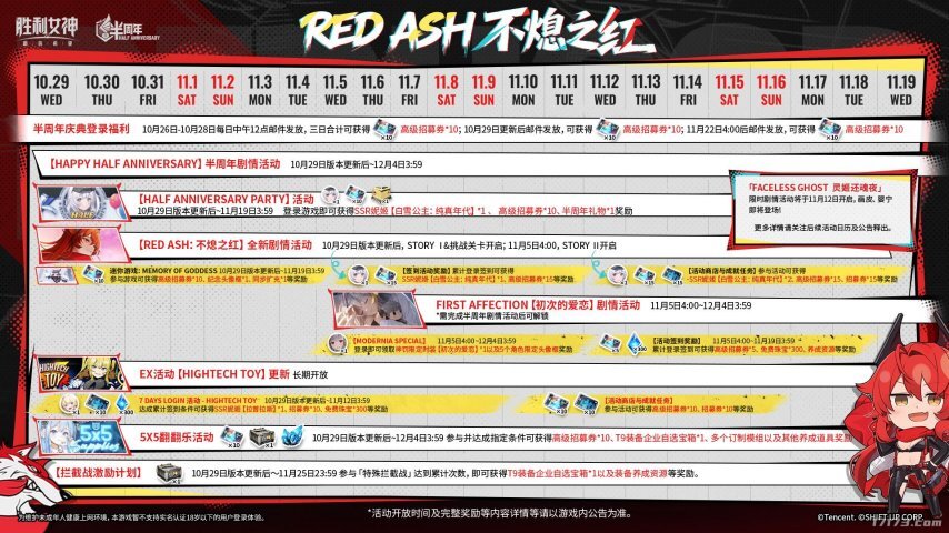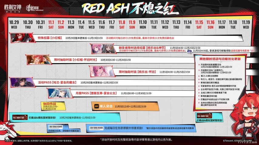 剧情活动「RED ASH 不熄之红」即将开启:本次活动将揭开女神部队的过往秘辛,讲述她们为扭转战局所采取的一系列关键行动。活动期间,指挥官可体验专属剧情关卡,通过挑战关卡获取活动代币,用于兑换丰厚奖励。