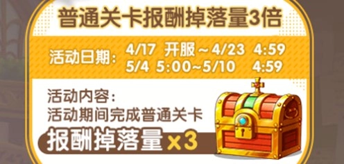 活动内容:在活动期间通关普通关卡,报酬掉落量将变为三倍。