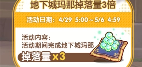 活动内容:在活动期间通关地下城,玛那的掉落量将变为三倍。