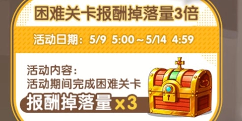 活动内容:在活动期间通关困难关卡,报酬掉落量将变为三倍。