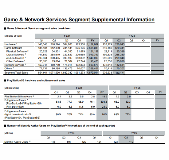 第二季度,PS4与PS5的游戏销量达到8030万份,较去年同期增加260万份。这其中,索尼互动娱乐(SIE)第一方游戏的销量为630万份,同比增长100万份。而数字版完整游戏的销量占比则达到了72%,相比去年同期提升了2个百分点。