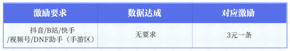备注:每位勇士最高结算100条,比如活动期间,小A选择抖音为主平台,则快手、B站、视频号、DNF助手(手游区)为分平台;若小A在抖音发布的50条视频分别同步发放到快手、B站,则对应奖励为3*50+3*50=300元。
