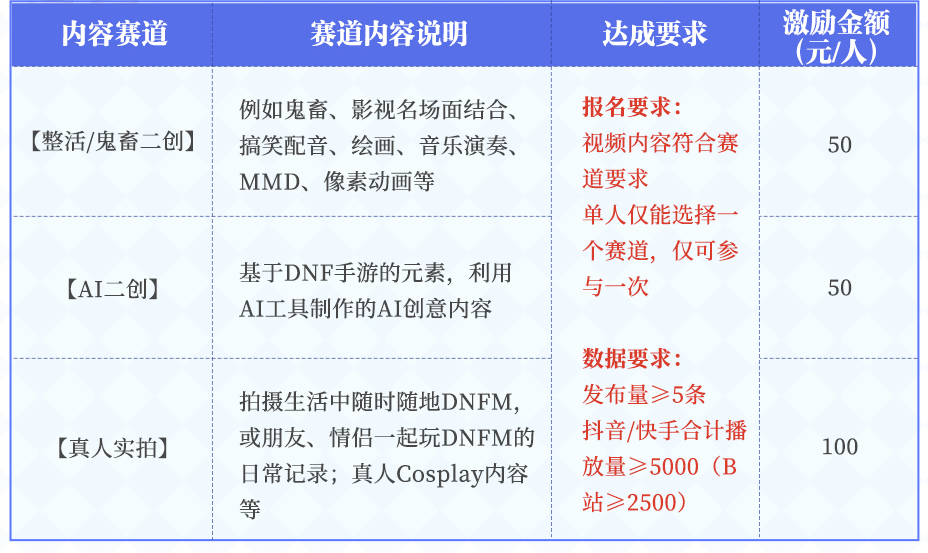 例如拍摄生活中随时随地玩DNF手游,或朋友、情侣一起玩DNF手游的日常记录;真人Cosplay内容等。