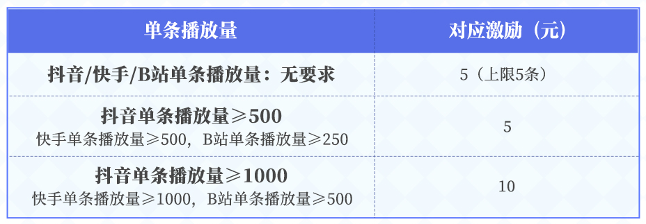 第二期活动,我们会根据勇士报名时选择的主平台,统计播放量最高的50条视频,并按其累计播放量发放对应激励奖金!多劳多得,爆肝不亏!