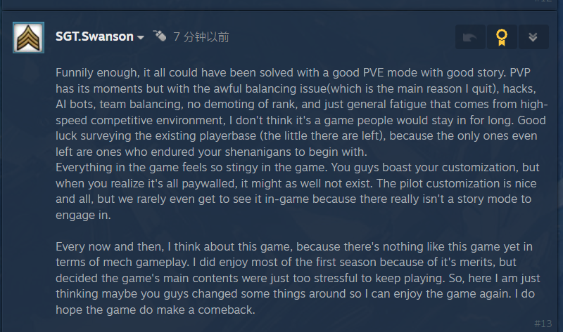 对于游戏当下的状况,项目组其实心里都有数,所以这里也没什么可藏着掖着的。一直以来,我们也从未怀疑过制作团队对机甲文化的热爱——毕竟早在十一年前,这个项目就已启动立项,而机甲风所蕴含的工业质感、科技内核与暴力美学,本就是能让所有玩家热血沸腾、肾上腺素飙升的存在。