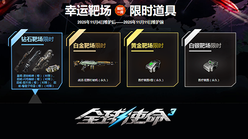 在固定的时间范围内,幸运靶场常会开启限时道具入驻活动,给玩家带来更多惊喜。2025年11月4日维护结束后到2025年11月11日维护开始前,钻石靶场一次性加入四款橙色时限武器:暴君-原始咆哮、超能-闪电枷锁、超能-堕天铳和超能-爆裂子母雷,涵盖近距离压制、远程精准打击等多种战斗场景。白金靶场限时推出永久武器战灵-狂野打桩机,黄金靶场和白银靶场分别上线医疗装置II型(永久)与医疗装置(永久),构建起从顶级战力到实用辅助的完整奖励层级,满足不同玩家的装备需求。