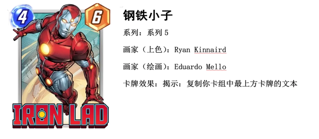 2、思路讲解。首先,钢铁小子这张卡在四费卡中,身材属于不亏战力的标准类型。这意味着,即便它没有复制到有用的卡牌,在4费回合准时打出,也不会亏。当然,要是能复制到强力的优质卡牌,这张卡就能发挥出超乎想象的强大效果。举例来说,复制钢铁侠或者惊奇队长,都能让你在4费这一轮获得极大的节奏优势。而且,只要这张卡复制得好,你适时点击snap,对手就会承受巨大的心理压力。毕竟,看到对手打出一张4 - 6的钢铁侠,谁能不心生畏惧呢。