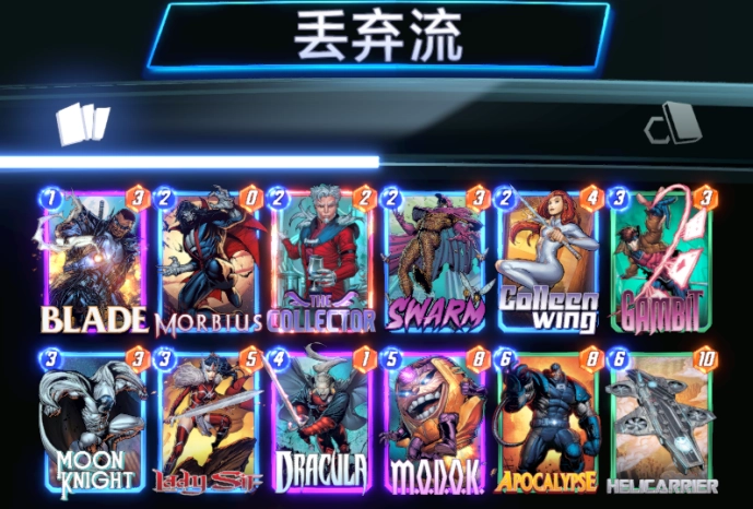 ①、传统丢弃流 首先笔者为大家推荐的是一套非常传统的丢弃卡组,不管是丢弃蜂群让你拥有数不尽的0-3,还是丢弃天启创造一个超级大哥,甚至丢弃神盾局的航空母舰,获得无数的随机卡,都会让人在丢弃的道路上欲罢不能,同时还能不断增加莫比亚斯和收藏家点数,可以说是强度与爽度并存的一套卡组。