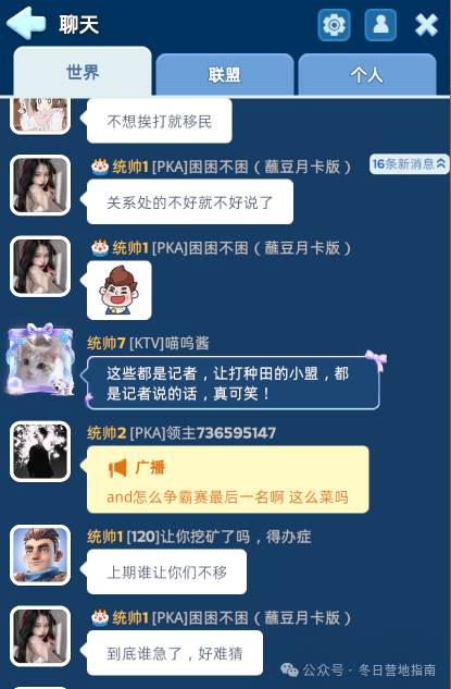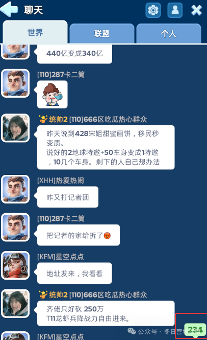 所以说,这个区要想恢复正常秩序,首要任务是给当前的局势降温,特别是本区的玩家先别再直播本区的情况了。毕竟对面那四个球的势力你根本清不掉,就算去攻击他们,人家也不会在意损失的那点兵力——想想看,连几百万兵力都能豁出去硬扛的大佬,怎么可能会把死掉的几十万兵放在眼里呢?还有打记者这种事,真的完全没必要做,这些人本来就闲得没事干,你看现在公屏几乎都被他们刷屏了,跟他们较劲没什么实际意义。