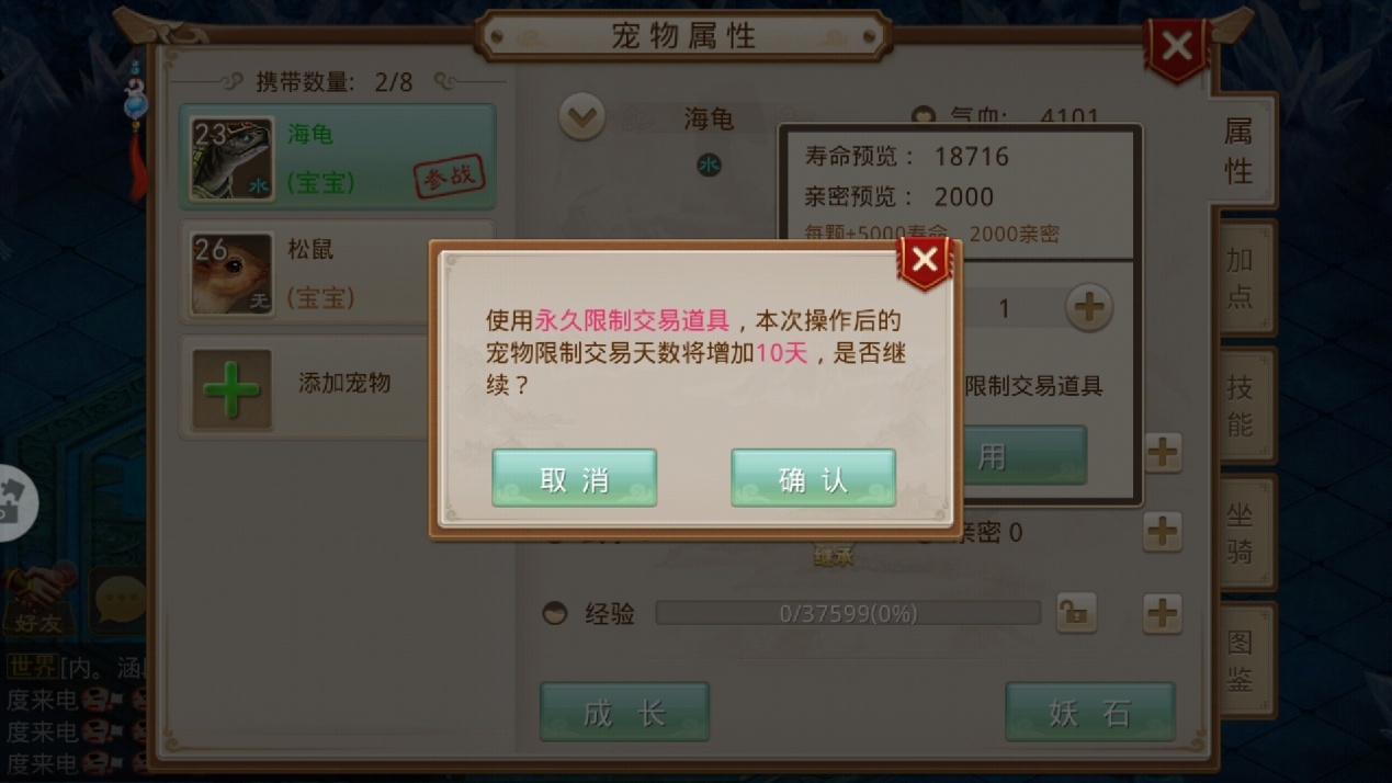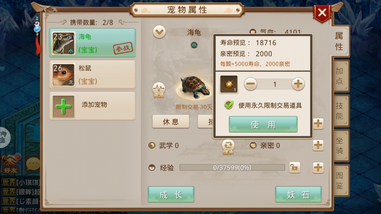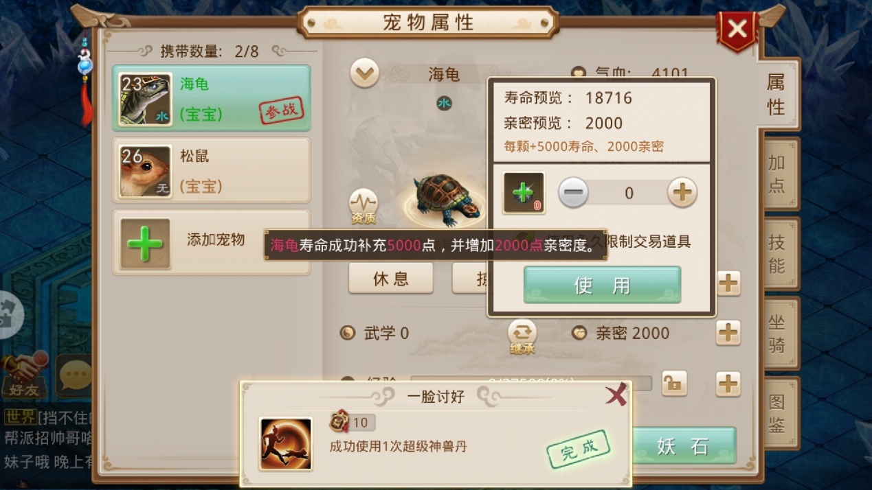 确认使用后,系统会在屏幕中央弹出提示:“成功补充海龟寿命5000点,同时增加2000点亲密度”。而对于首次使用该道具的玩家,还能完成“一脸讨好”的任务,具体效果如下图所示。