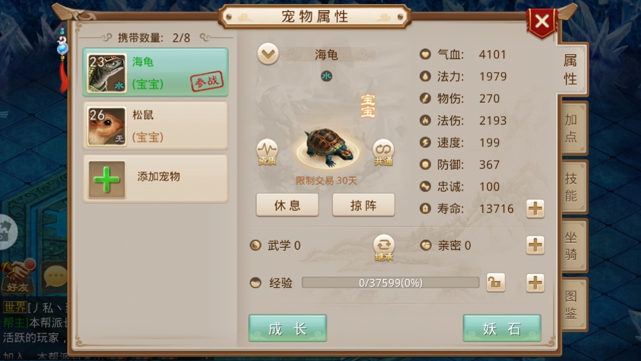 接下来我们能看到界面里呈现出我们的宠物信息,宠物图片的右侧有一系列属性标注,这时候我们需要点击属性标注最下方“亲密”旁边的加号按钮,以此调出增加亲密度的相关界面。