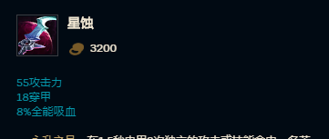 第四件装备玩家可以优先选择吸蓝刀,吸蓝刀与无尽都能提供暴击几率,而无尽之刃可大幅提升狮子狗的暴击伤害。吸蓝刀在当前版本强度很高,狮子狗的Q技能算作普攻,能完美触发吸蓝刀的被动效果。