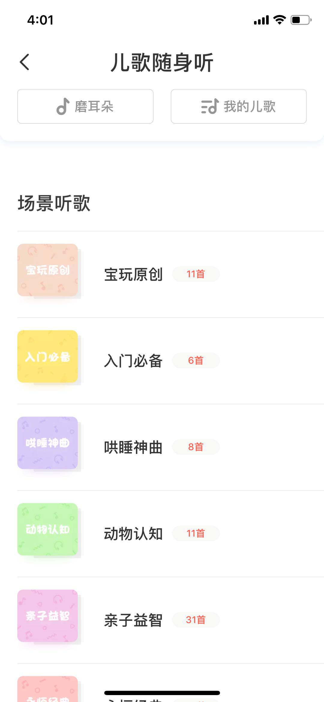 在成长兔英语APP里,英语学习依托一套完整的科学体系展开,该体系把英语学习划分为听、看、读三个板块。APP首页设有【磨耳朵】专栏,里面收录了不少广为流传的英语歌曲,点击专栏中的【更多】按钮,就能进入英文歌专属板块。