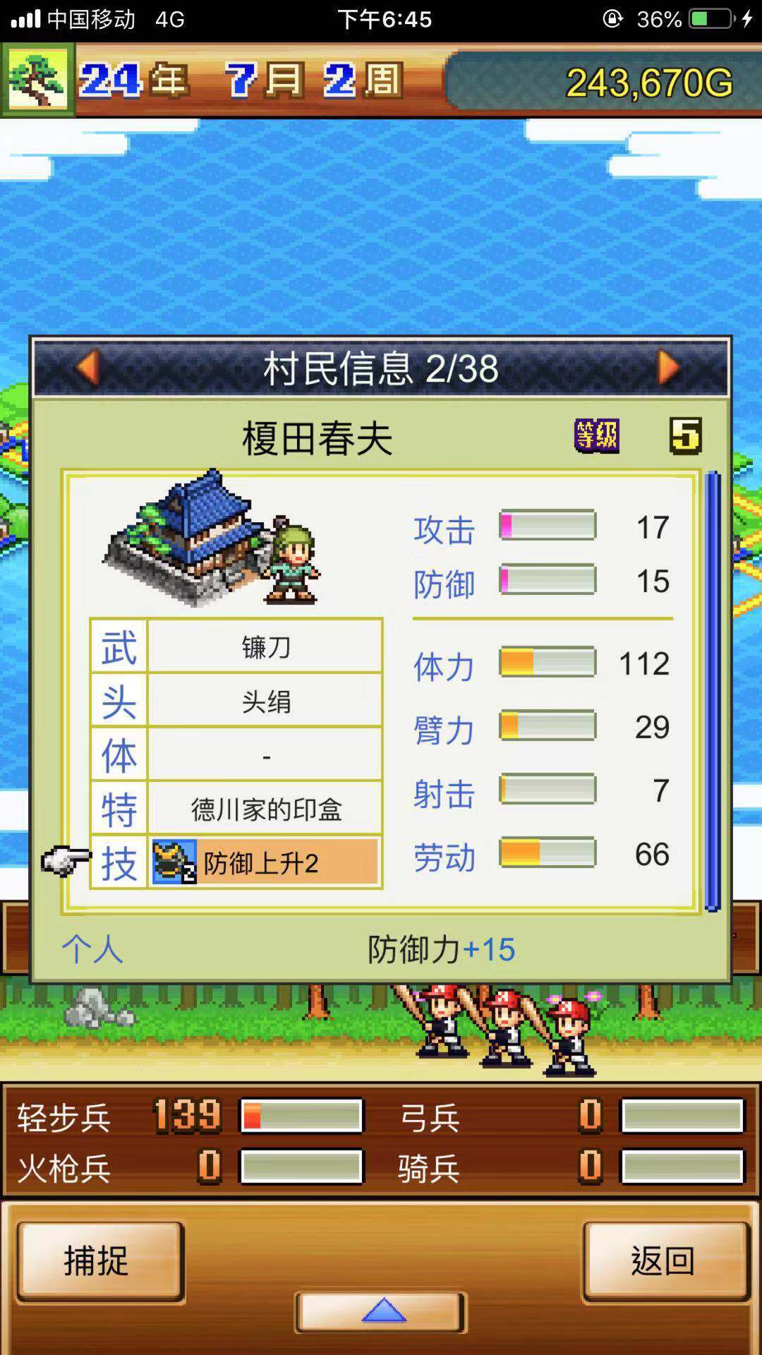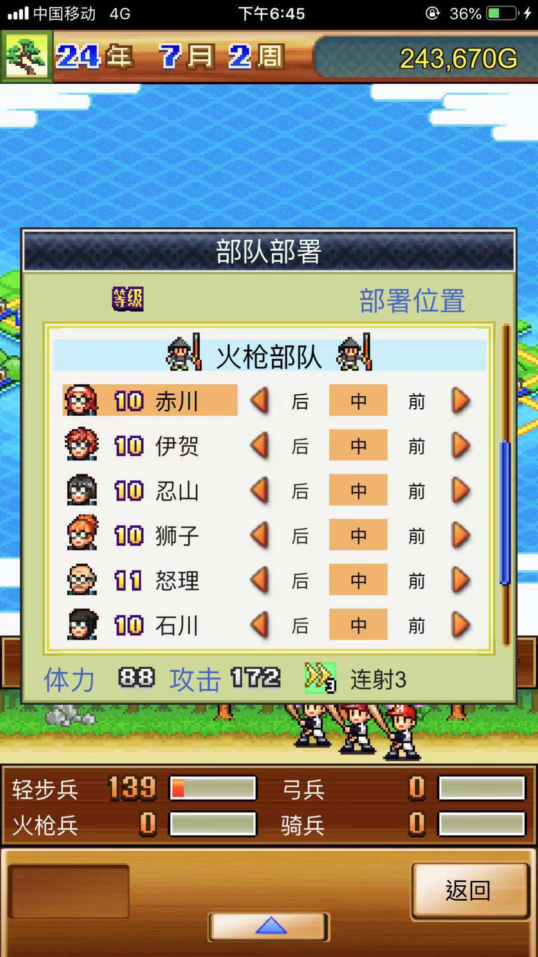 第二步:把手上所有具备连射技能的角色都配备焙烙火矢和忍者铠,我数了数,只有赤川、怒理与忍山忍这三位拥有连射效果。此外再带上一个狮子丸和两名能使用焙烙火矢的普通村民,如此便组成了6人火炮阵容。
