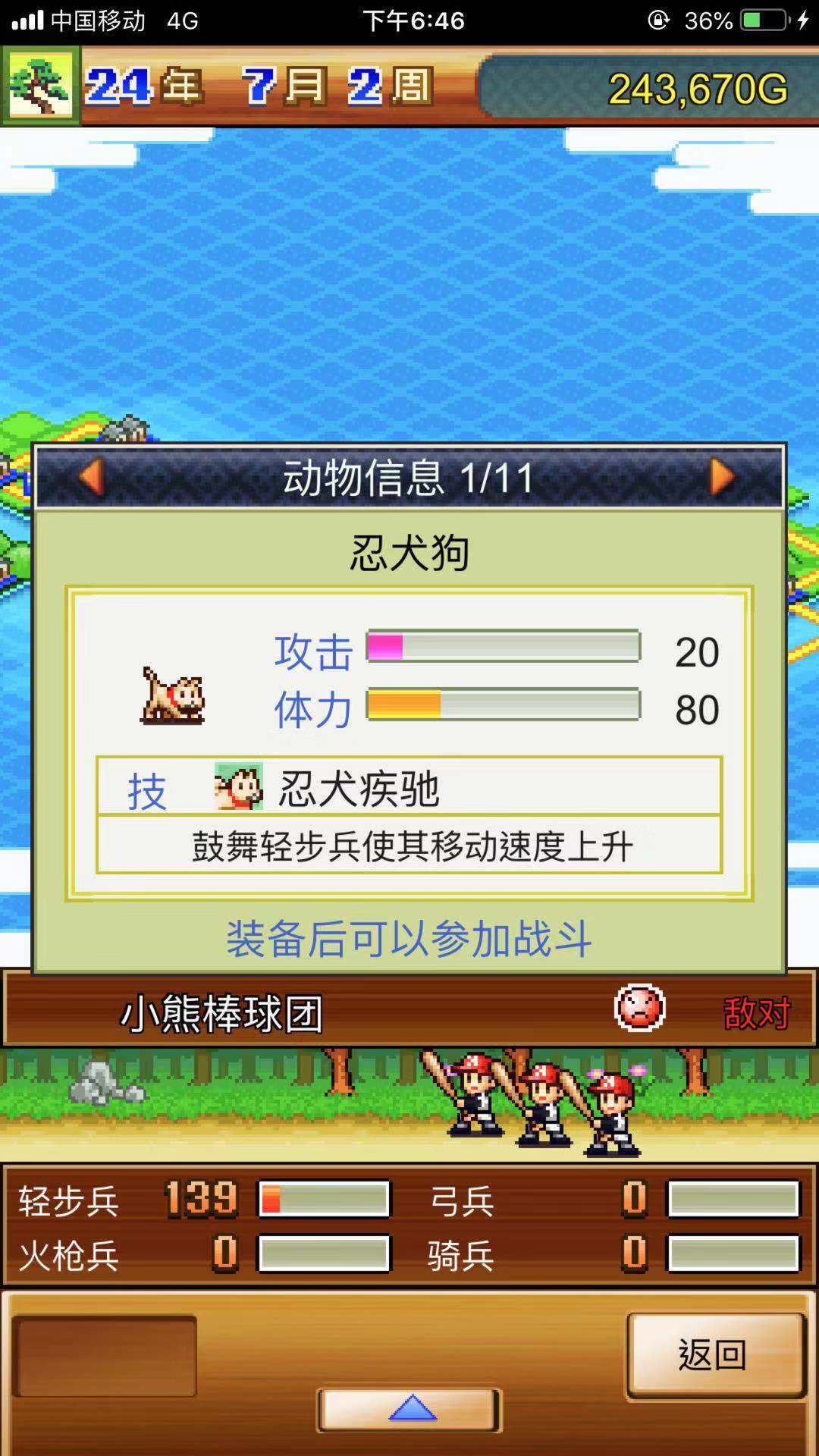第四步:为火炮兵配备忍者铠与焙烙火矢,给轻步兵穿戴当世足具。在野外作战时,我们会获得各类宠物。除忍者犬外,其他宠物都让火炮兵使用;轻步兵携带忍者犬能提升移动速度,这使玩家有可能在首回合就消灭敌方部分骑兵。