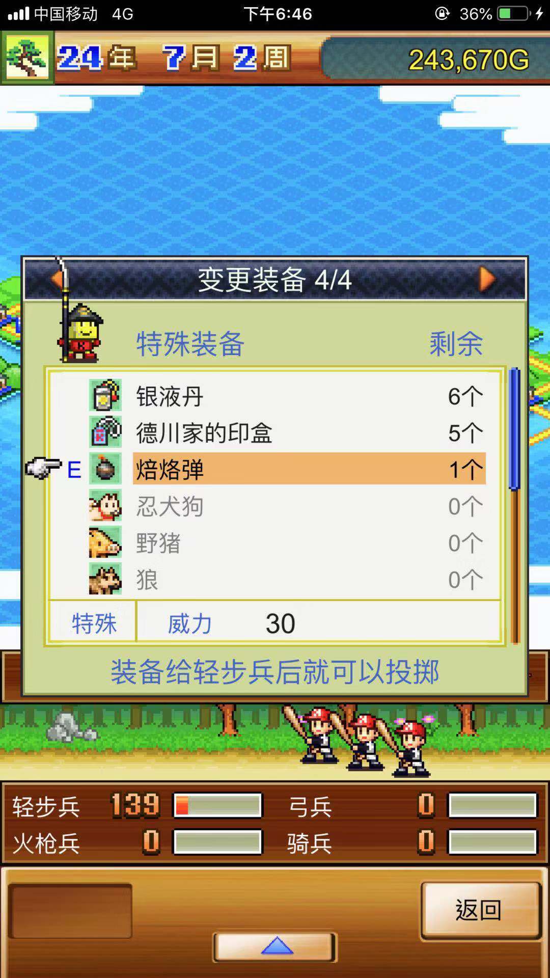 轻步兵统一配备焙烙弹,在作战时会将这些炸弹投掷于地面,当敌方骑兵冲锋而来时,部分骑兵会被炸死。(另外,头部装备也需配备,直接选购最贵的即可,但要注意轻步兵和火炮手的装备不能混淆)