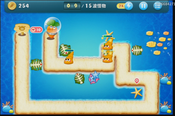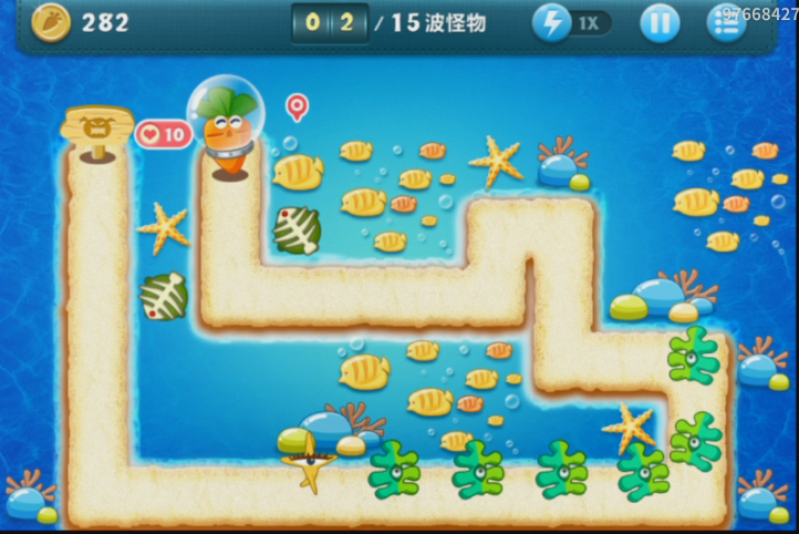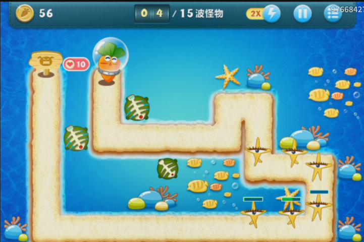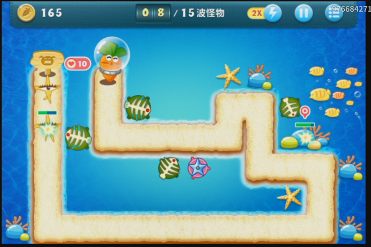 当瘦瘦的海星出现的时候,在出口的时候会受到第一个塔防的攻击,然后就是下面的鱼骨的攻击,最后在接近萝卜的时候被最后的一道防线消灭。