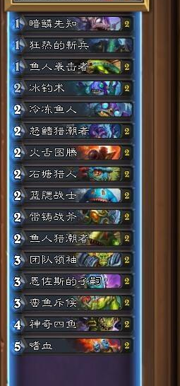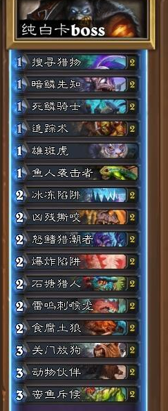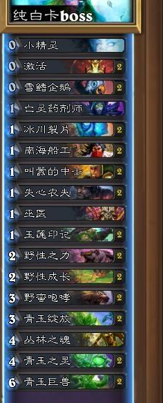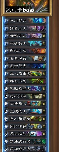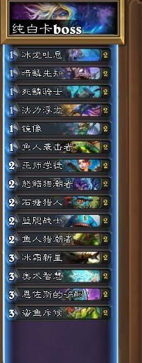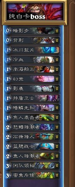 萨满就是我试验纯白卡通过关卡的首先职业,思路和普通全卡通过关卡的相似,鱼人相互buff,辅以火舌、嗜血在7费boss提刀以前斩杀。因为没领军和强化全部鱼人的恐龙,我带上了更加多的buff牌,包含111狂热的新兵和322恩佐斯的子嗣。