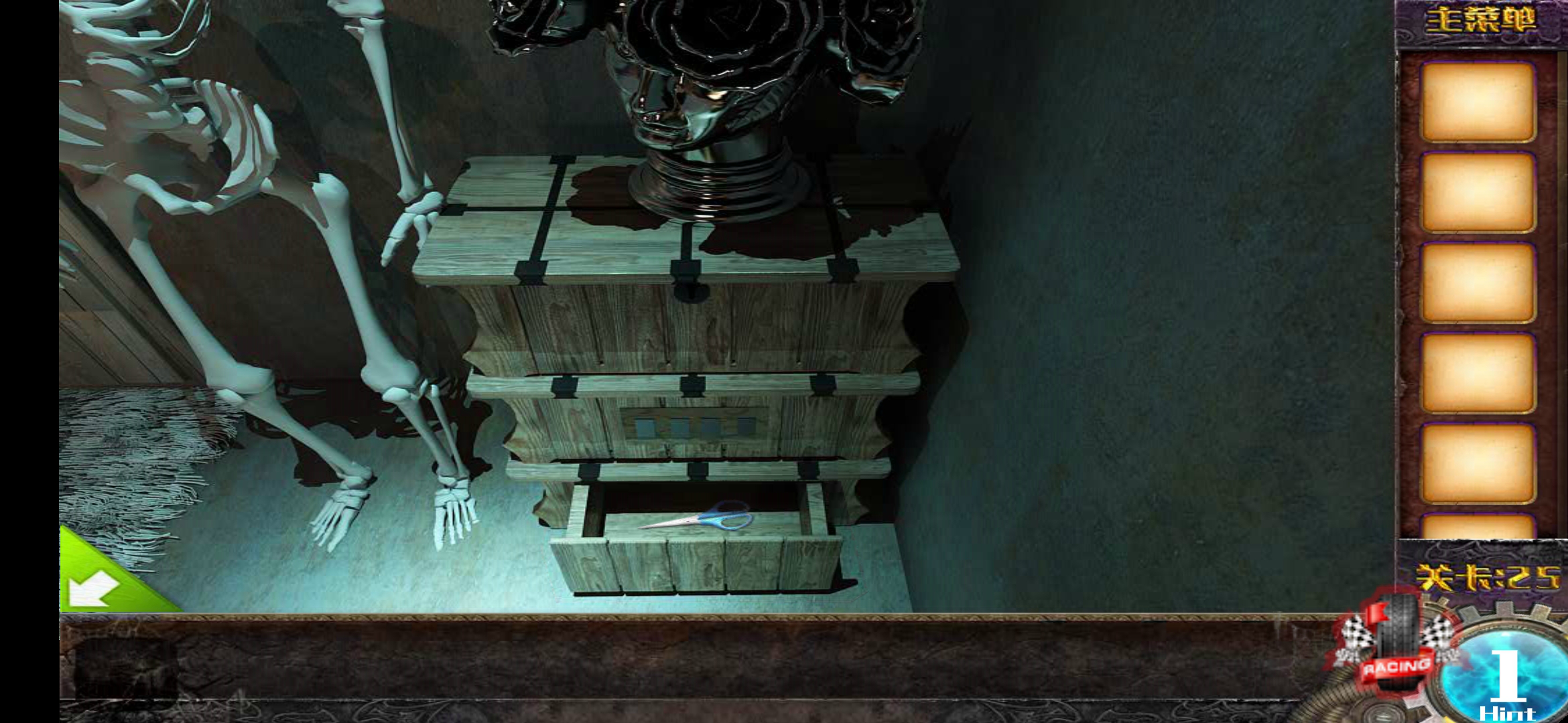 第2步,点击右侧墙角柜子,点击最下方的那个抽屉,得到一把剪刀。