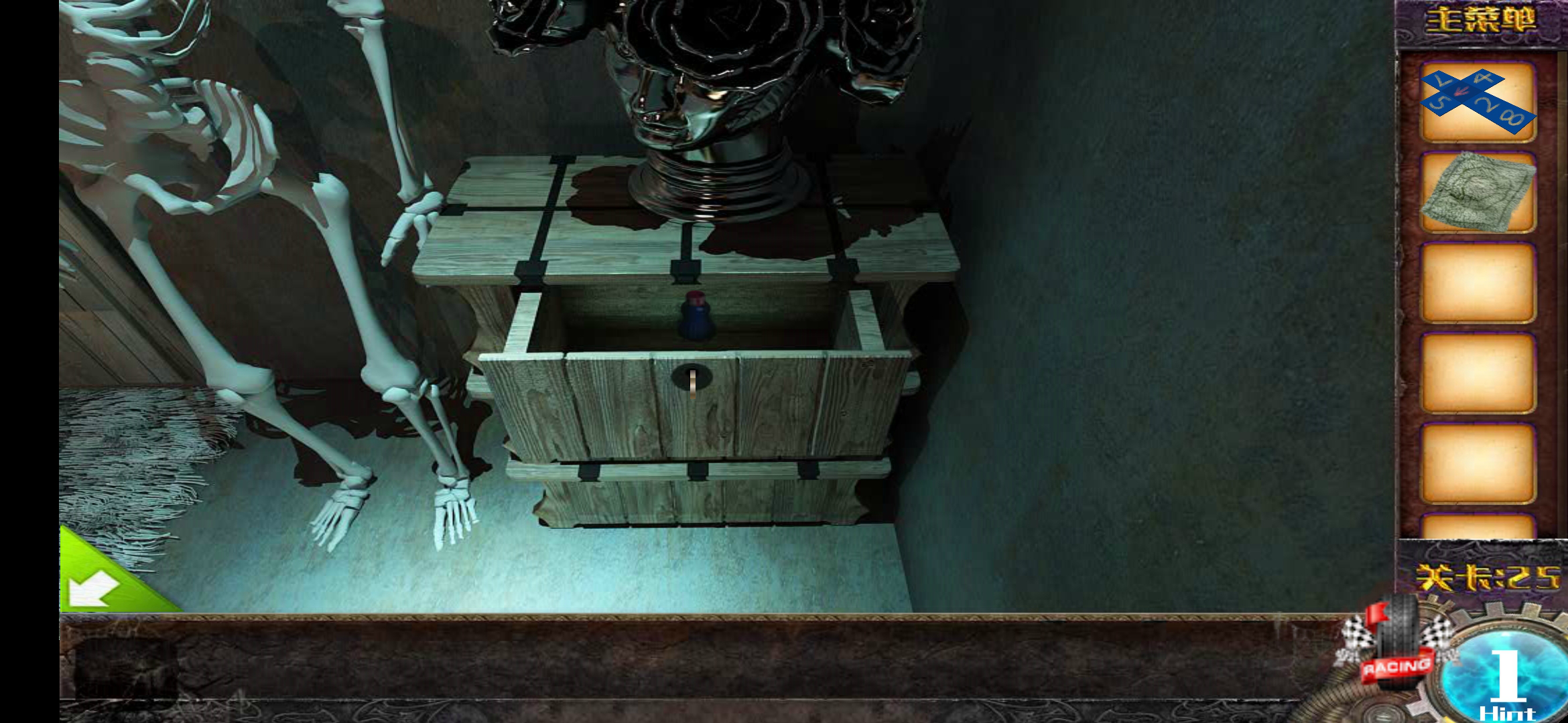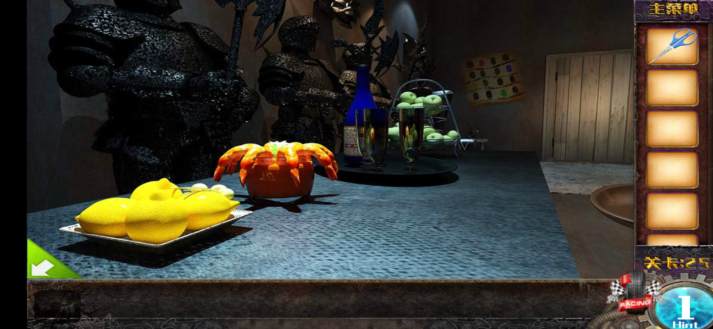 第二十五关的场景氛围阴森恐怖,先来了解本关的各个元素:第一个是位于门口右侧墙角的柜子,第二个是挂在右侧墙上的油画,第三个是放置在右边地面上的油画,第四个是左侧区域的桌子,第五个是左侧的橡木桶,第六个是左侧的椅子,第七个则是贴在门口左侧的壁纸。