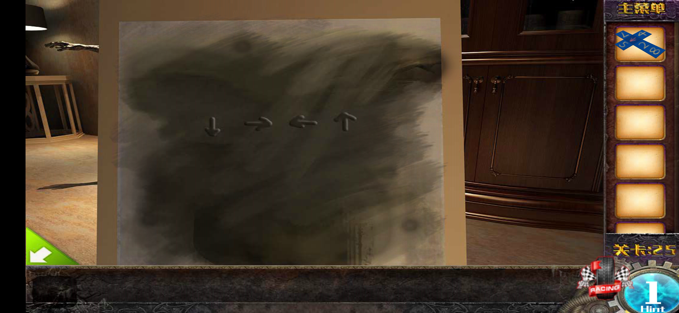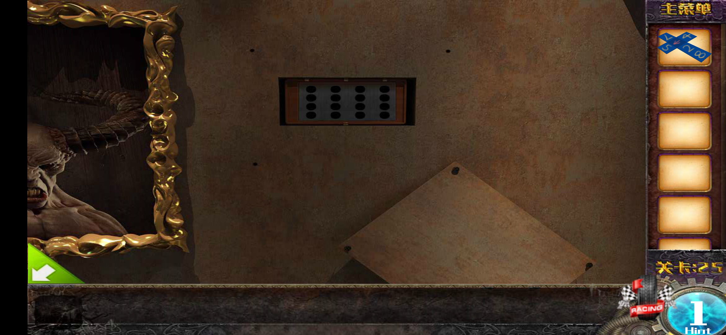 第14步,点击门口右侧的壁画,用铁锤砸开暗格后会出现一个密码锁,接着用第六步得到的数字组合,按照竖排横排的顺序依次点击对应的位置,就能打开抽屉拿到本关的通关钥匙了。