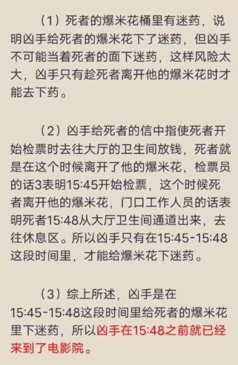 在第一幕的对话里,玩家能知道凶手是在晚上5点27分之后才离开影厅的。已知放映员当时有两段黑屏换片的间隔,那么所有疑问就都集中在这两段黑屏的时间段上了。从剧本里的打架情节能看出,死者进电影院时爆米花是满杯的,可去世时爆米花已经快吃完了,所以能确定凶手绝对是在第二次黑屏换片时动的手。另外线索显示小刀是深深扎进死者胸口的,由此可以推测,要么死者和凶手之间有很深的仇恨,要么凶手是用了很大力气把刀插进去的,所以嫌疑人应该是比较瘦弱的。