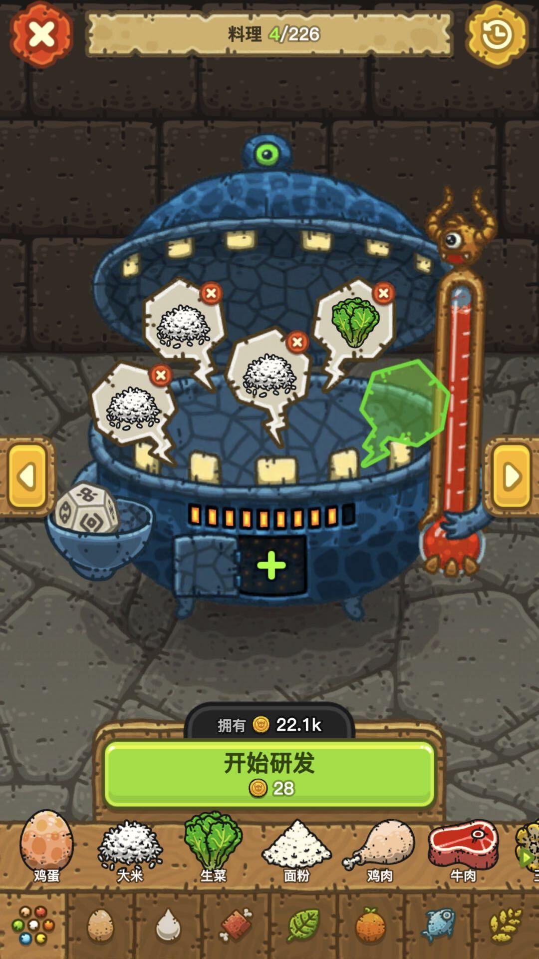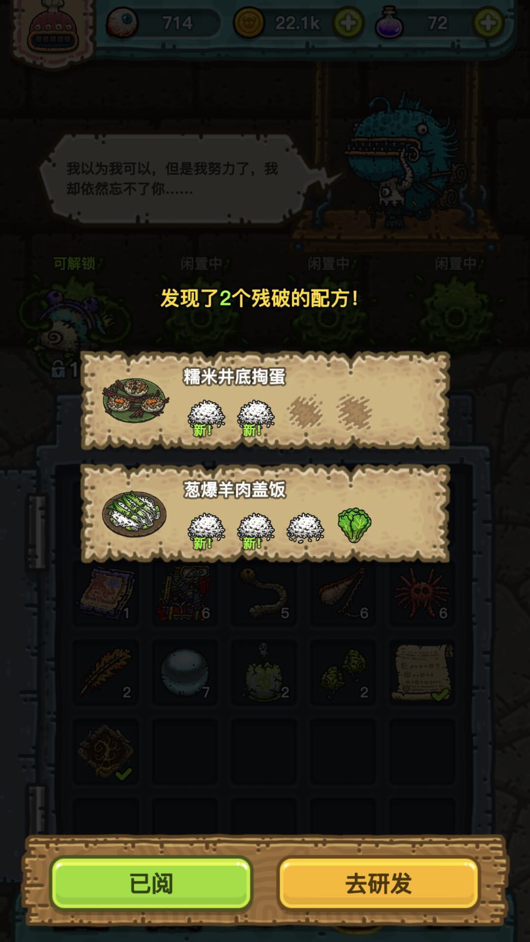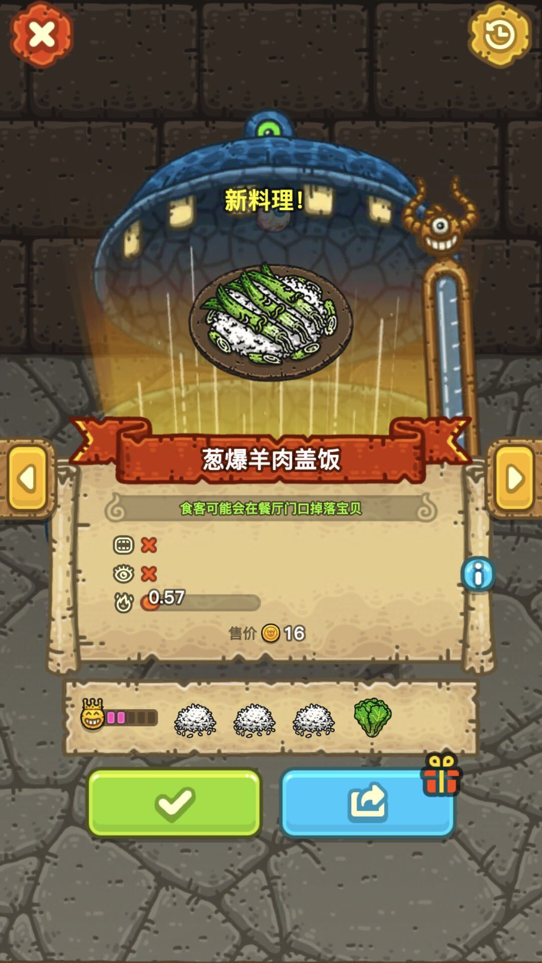 明白了,确认清楚之后,我们就按照配方里3份米饭搭配1份生菜的比例来制作,触媒可以根据自己的需求选择加或者不加。等研发完成,你就能得到葱爆羊肉盖饭这道料理啦!而且这还是带有黑暗属性的料理,能让客人掉落宝贝呢。