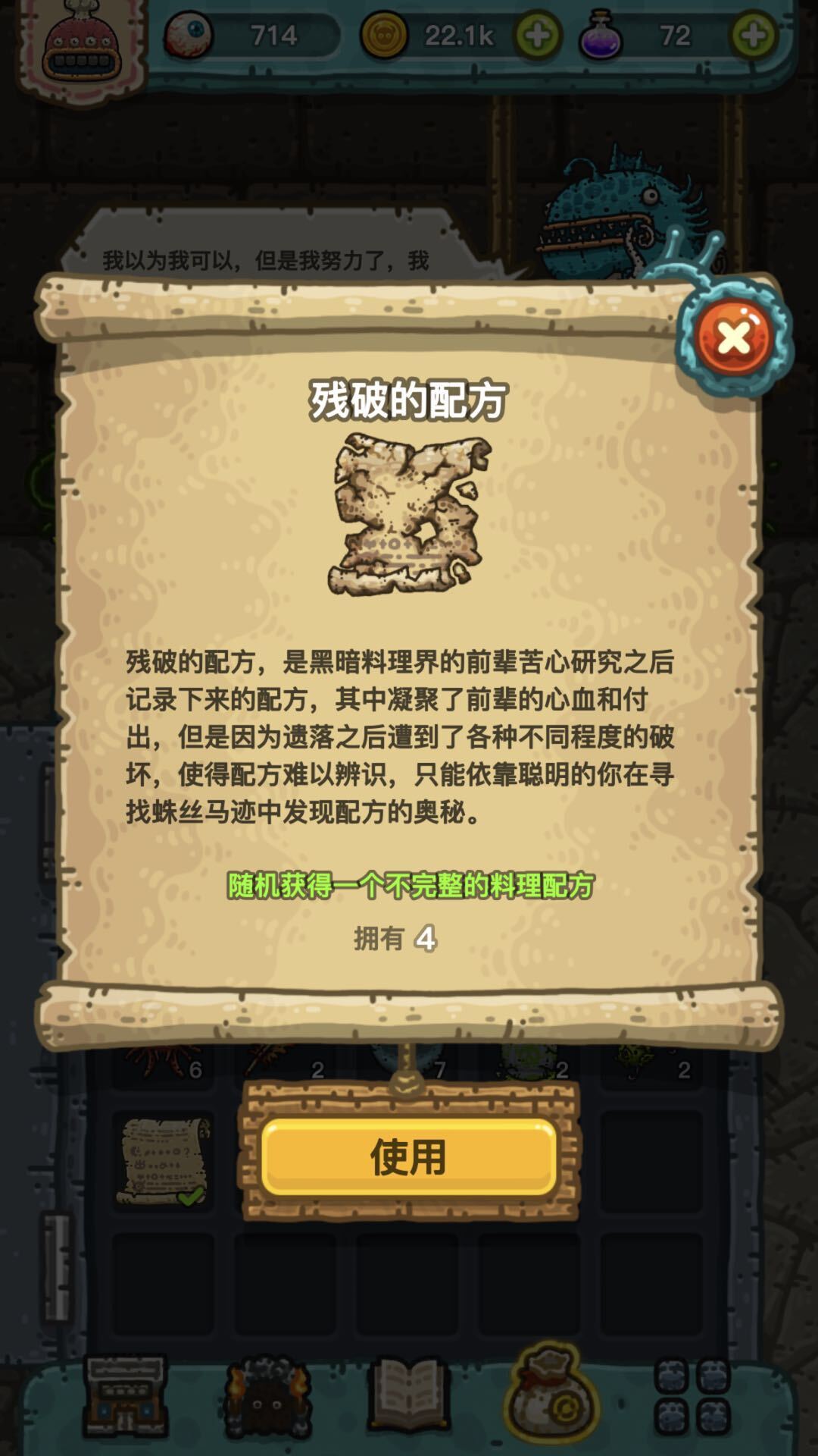 2. 找到背包中通过探险或其他途径获取的残破配方,点击【使用】后,有机会随机得到一个不完整的配方。不过这得看运气,之前葱爆羊肉盖饭的不完整配方就是这么来的,要是这次运气好,说不定还能拿到完整的配方呢!