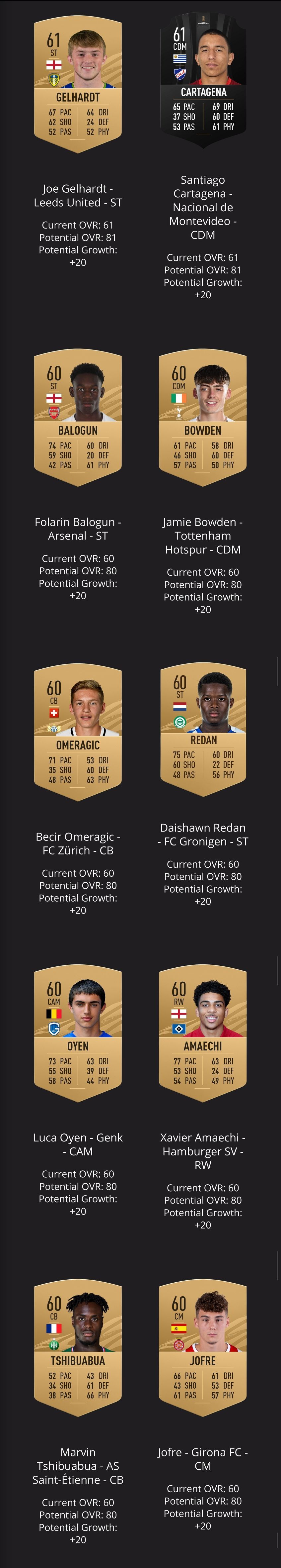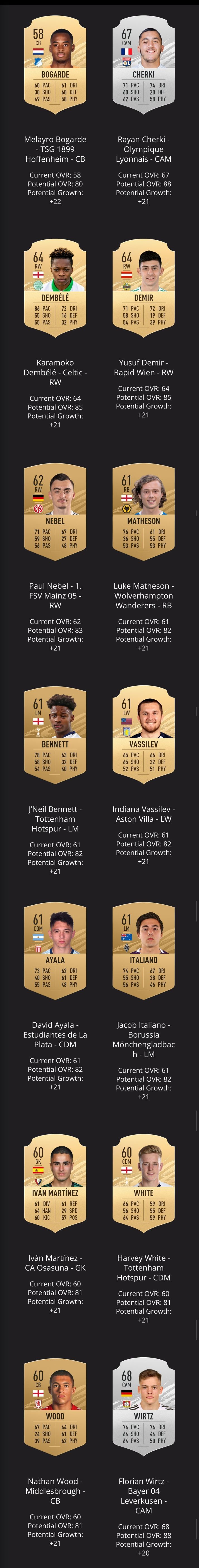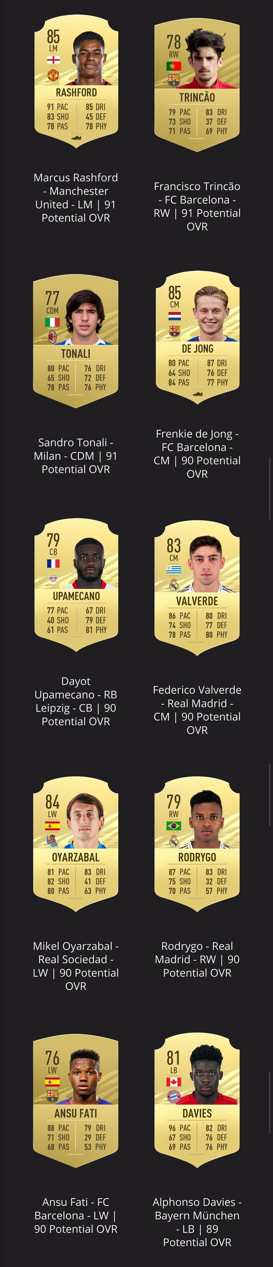 第一个名单为FIFA21中成长后评分最高的妖人TOP20: