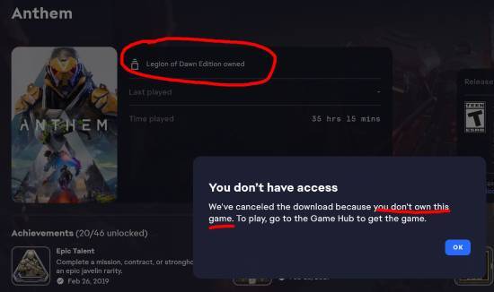 多家媒体与社交平台上的玩家反映,许多之前购买过《圣歌》的老玩家在尝试重新下载该游戏时,被EA App“拒绝”了。从系统截图能看到,游戏界面居然显示“你并不拥有此款游戏”的提示。