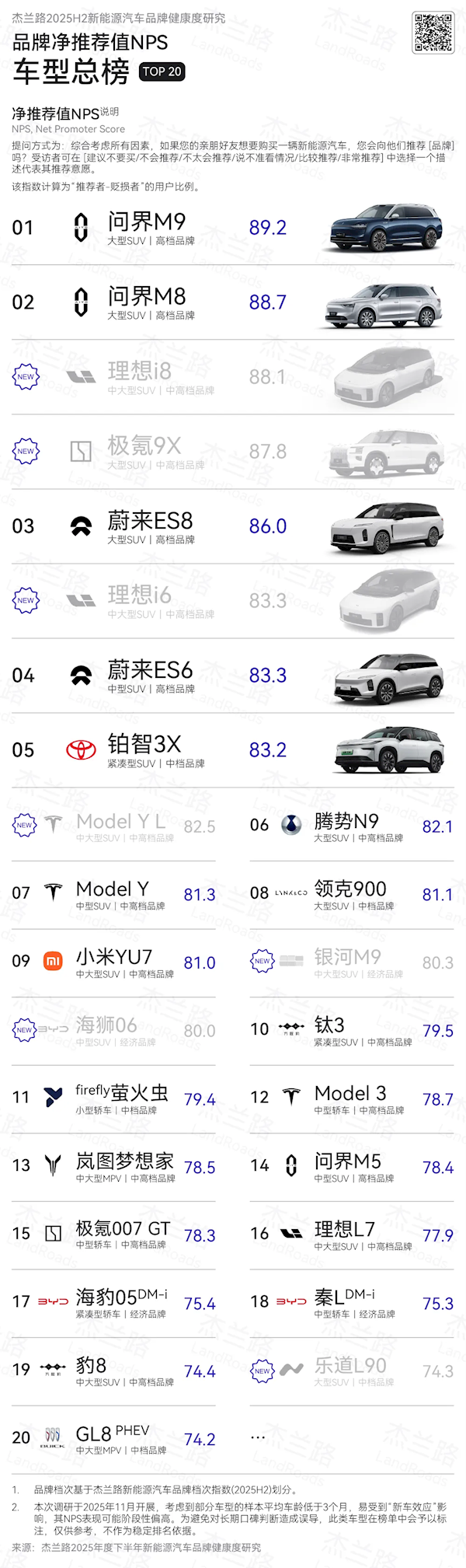1月6日消息,杰兰路于今日发布了2025年度下半年新能源汽车品牌健康度研究报告(NPS篇)。