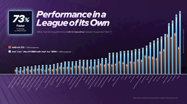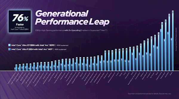 Intel指出,Core Ultra X9 388H在Cinebench 2024的测试里,当两款芯片功耗都控制在25W时,其多线程性能相较Core Ultra 9 288V提升幅度达到60%。另外,对比Core Ultra 9 285H,Core Ultra X9 388H的游戏性能提升最高可达76%——这一数据是基于45款游戏的平均值测试得出的,测试是在1080p分辨率下开展的,而且在支持XeSS的游戏中开启了2倍分辨率缩放功能。