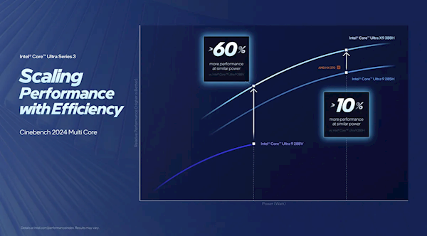 在性能表现方面,Panther Lake在功耗相同的情况下,单核性能相比上一代Lunar Lake提升幅度超过10%;而多线程性能由于核心数量翻倍,实现了超过50%的大幅增长——要知道前代Lunar Lake的核心数最多仅为8个。