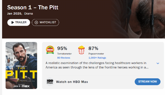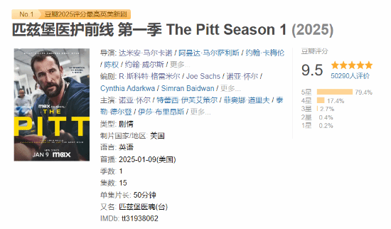 值得一提的是,《匹兹堡医护前线》第一季收获了极高的评价,不仅获得IGN的满分认可,烂番茄新鲜度达到95%,豆瓣评分更是高达9.5分,同时它还位列2025年豆瓣评分最高的英美新剧榜首。