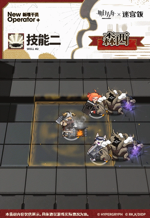 技能一经开启,森西便着手烹饪,在接下来的3秒内会停止攻击。待烹饪结束,将治疗身旁的一名友方角色,助其恢复一定生命值,同时该友方角色还会随机获取以下增益中的一项:攻击力提高、攻击速度加快、生命上限增加,这些增益效果将持续数秒。
