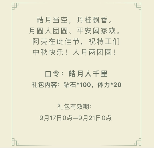 口令礼包码为:皓月人千里