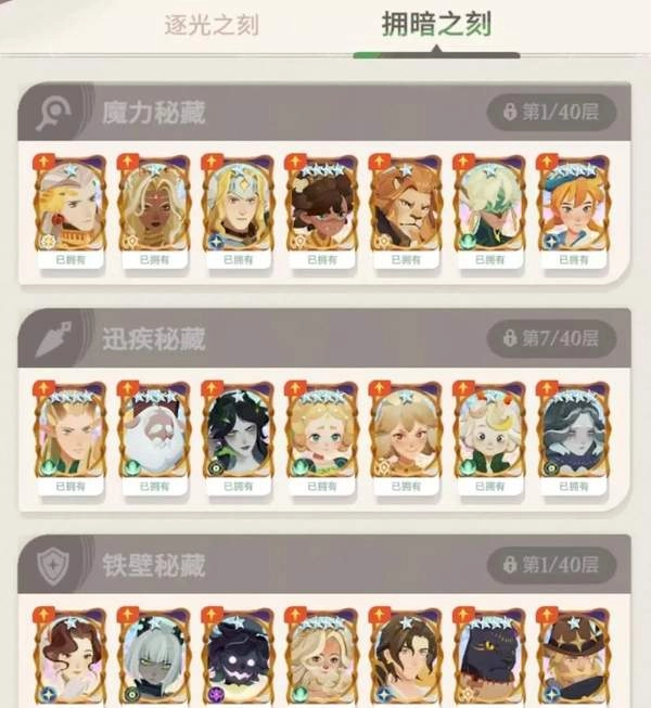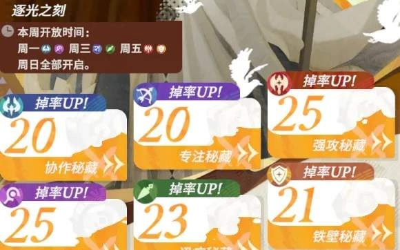 逐光之刻与拥暗之刻会隔天交替开放。周一到周六,每天依次开启2个秘藏挑战;每周日则会开放指定主题的全部6个秘藏挑战,如此每两周构成一次完整循环。