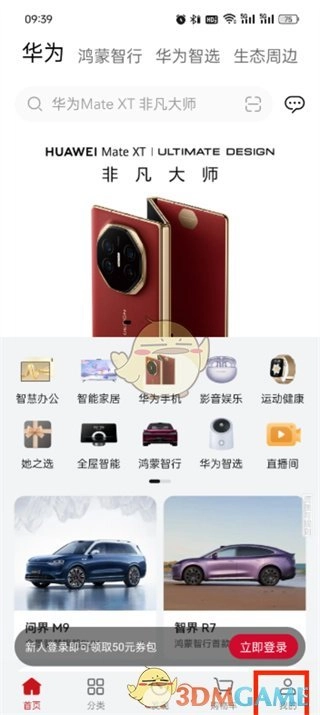 1. 第一步,打开华为商城app,待进入首页后,能够切换至不同页面,此时点击右下角的【我的】。