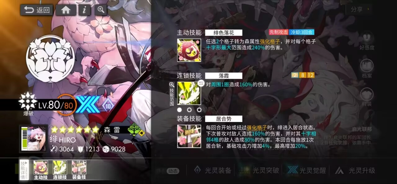 首次觉醒能够开启装备技能。二次觉醒会让居合势在踩到强化格时也能触发。三次觉醒后,每次释放居合斩,自身在本回合可获得4%基础攻击力,最高能叠加至20% 。