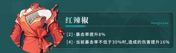 四件套效果:当角色当前暴击率达到或超过30%时,角色所造成的伤害会提高16% 。