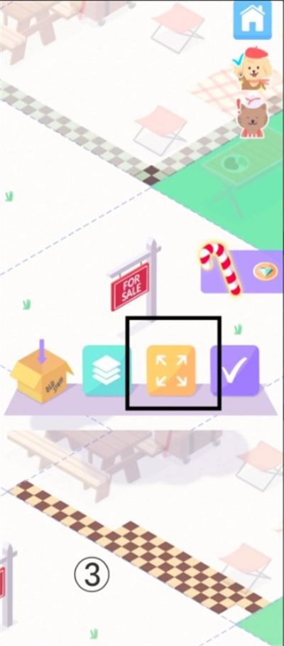 如①所示,点击后所有内容将被全部选中(如②所示),此时便可一次性收起草坪;[建议:在“装修”过程中,可将右侧图标与未选中的建筑物隐藏或降低其透明度]