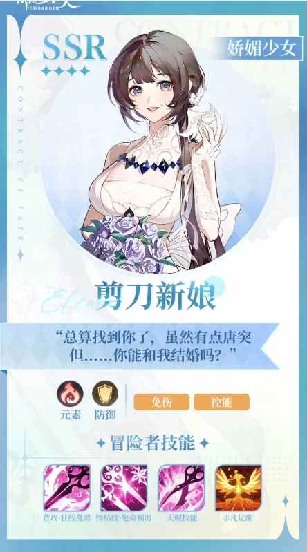 《命运圣契》中剪刀新娘有哪些技能呢?她的终结招式能够削弱敌方前锋的防御力,降低其战斗效能,从而显著削减敌方的战斗力。下面,小编整理了她具体的技能介绍,大家一起来看看吧。