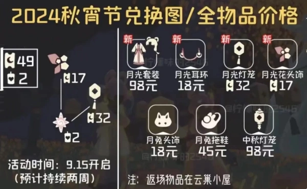 光遇2024年秋宵节会有哪些物品呢?在光遇这款游戏中,每个节日都会开展相应的节日活动。就像即将来临的中秋节,光遇游戏便会开启对应的秋宵节活动。那2024年秋宵节究竟有哪些物品呢?下面是小编整理的光遇2024年秋宵节物品兑换图一览,各位不妨瞧瞧。