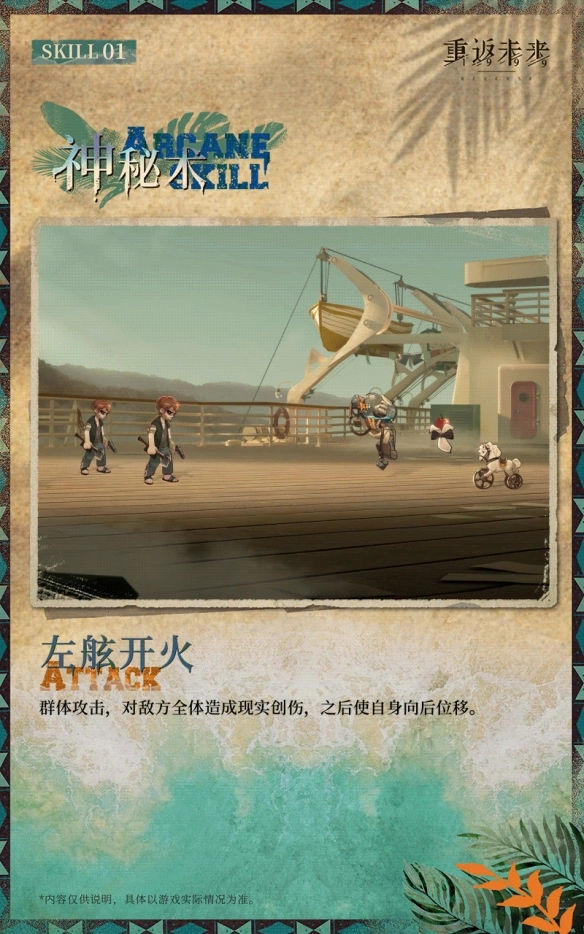 群体攻击技能,仅在【跳帮作战】状态时方可释放。释放后,角色会位移至队伍最前方,对敌方全体造成现实创伤,同时使敌方全体陷入【眩晕】状态。