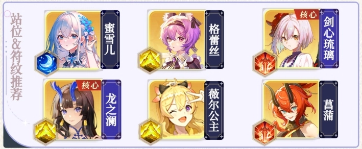 1. 阵容构成:蜜雪儿、剑心琉璃、格蕾丝、龙之澜、薇尔公主、菖蒲