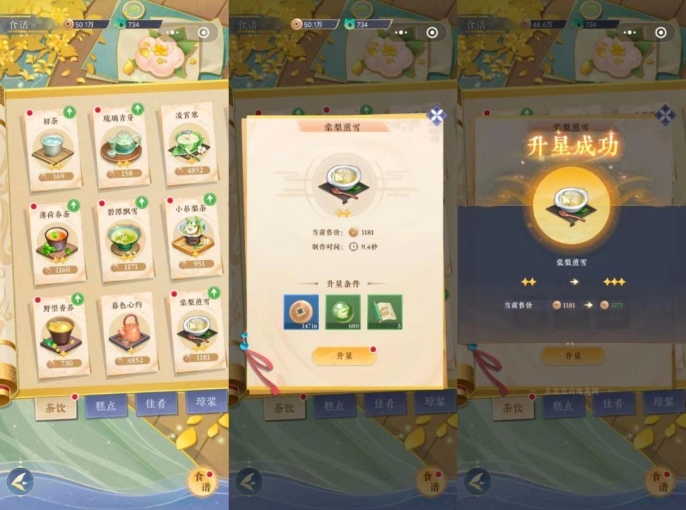 对茶馆的【食谱】进行升级,部分餐品具备升级潜力,只需运用[铜钱]、[食谱点]以及[启蒙书籍],便可使餐品的售价得到提高!