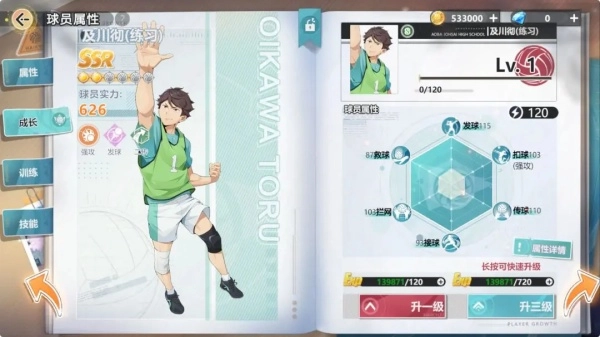 1、及川彻效力于青叶城西高中,其实力在SSR级别球员中仅为626,属于一级水平。