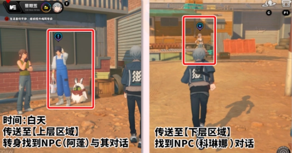 1. 进入游戏之后,朝着上层区域行进,抵达后与NPC阿蓬展开对话。