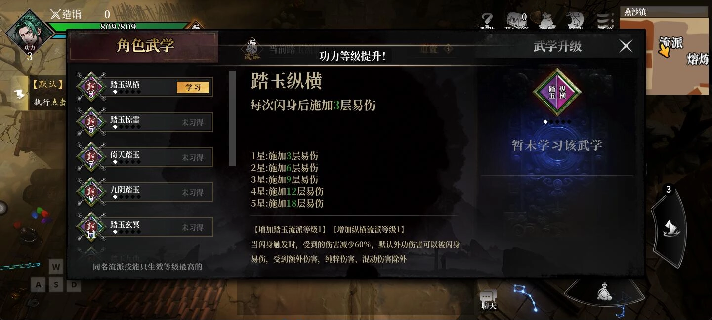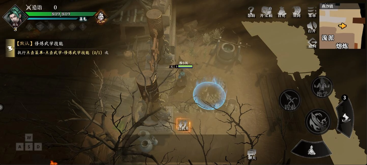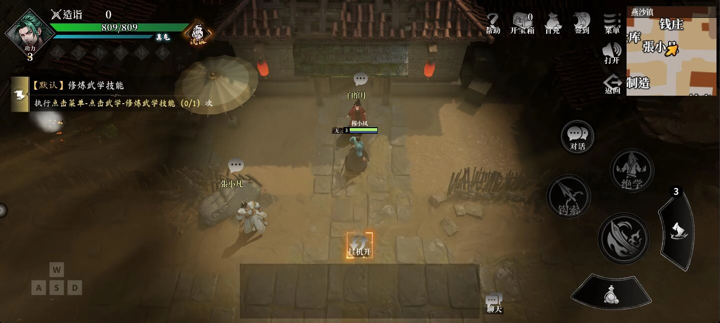继续引导,玩家将进入【江湖试炼】模式。此模式操作简便,主要以挂机形式来提升等级,同时还能获取一些新手装备,以及升级技能和易容所需的道具。